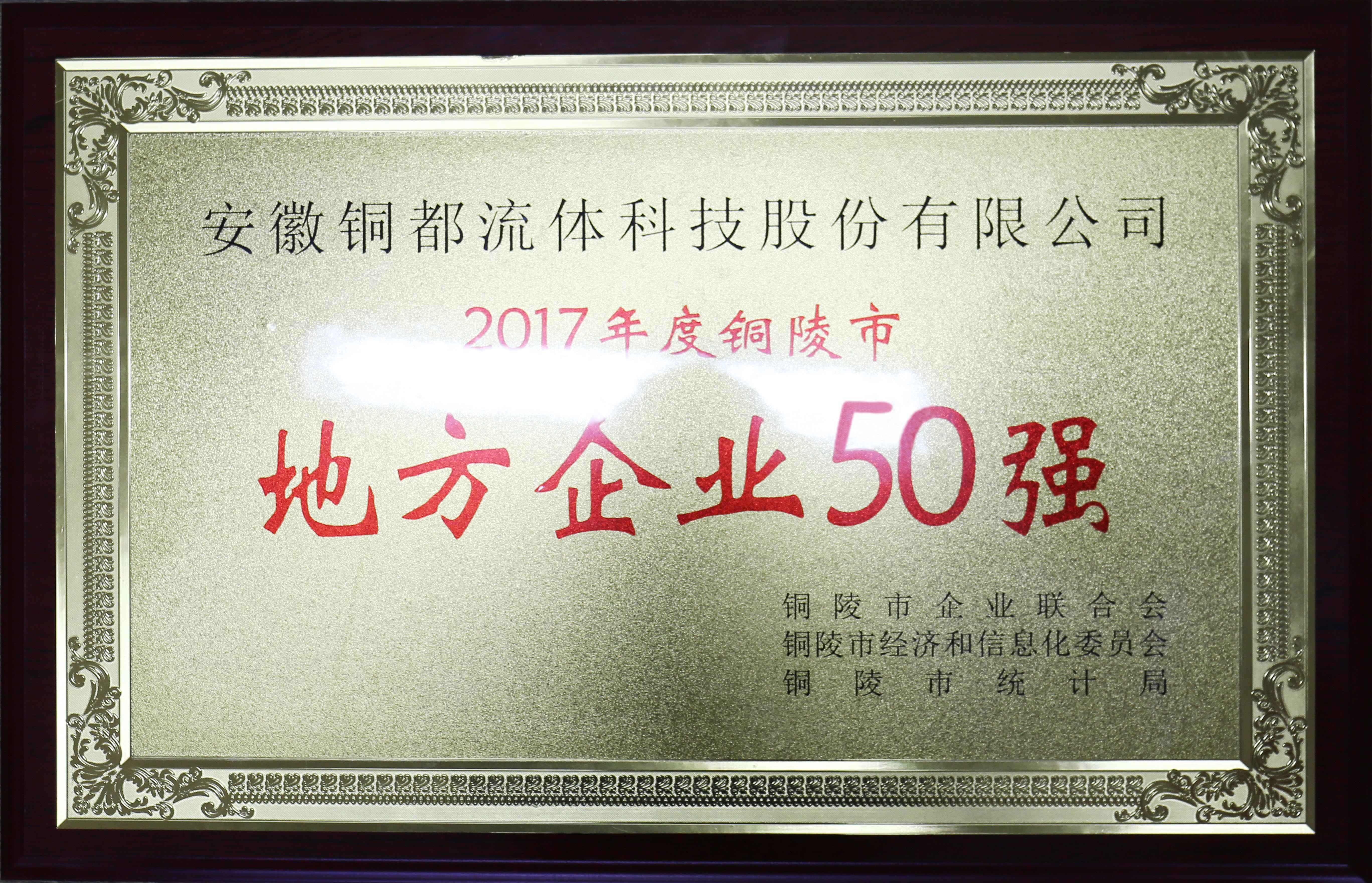 根據中共中央、國務院兩辦關于《貫徹落實〈中共中央、國務院關于營造企業家健康成長環境,弘揚優秀企業家精神更好發揮企業家作用的意見〉分工方案》文件要求,展示銅陵市骨干企業的良好形象和發展業績,市企業家聯合會、市經信委、市統計局參照國際慣例和國內通行做法,以銅陵市地方法人企業作為申報資格,以2017年企業營業收入為主要標準,開展了2017年銅陵市"地方企業50強"評比活動,安徽銅都流體科技股份有限公司榜上有名。
