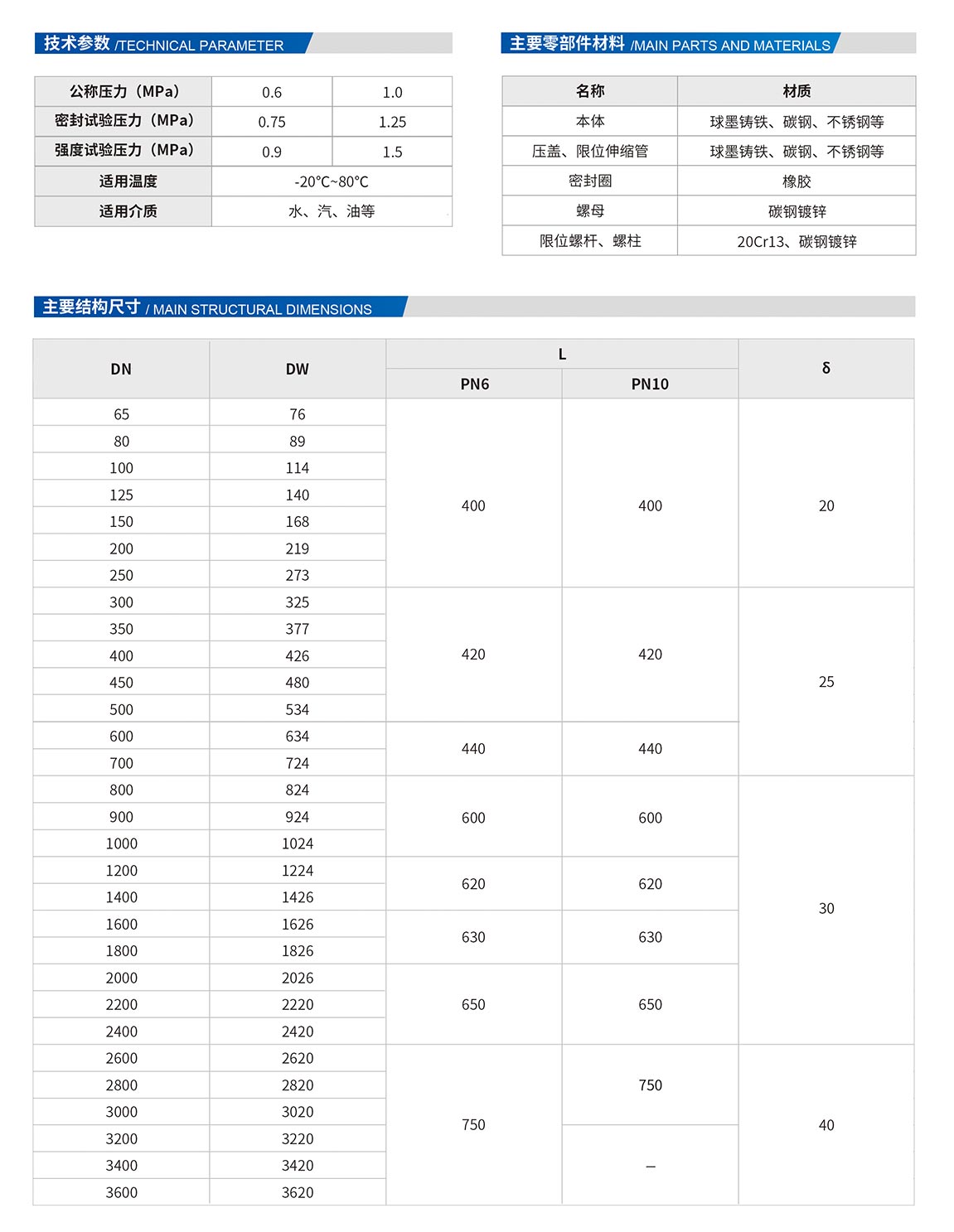 雙法蘭傳力接頭:由本體,密封圈,壓蓋,伸縮短管等主要部件組成。該產品適用于兩邊均為法蘭連接的管道中,安裝時調節(jié)產品兩端的法蘭的安裝長度,對角均勻擰緊壓蓋螺栓,使其成為一個整體,并有一定的調節(jié)量,方便安裝維修時,根據現(xiàn)場尺寸進行調整。在工作時可以反軸向推力傳遞至整個管道。雙法蘭傳力接頭是由法蘭松套伸縮接頭和短管法蘭,傳力螺桿等構件組成,能降低被連接件的壓力推力(盲板力)和補償管路安裝誤差。雙法蘭傳力接主要用于泵、閥門等附件的松套連接。