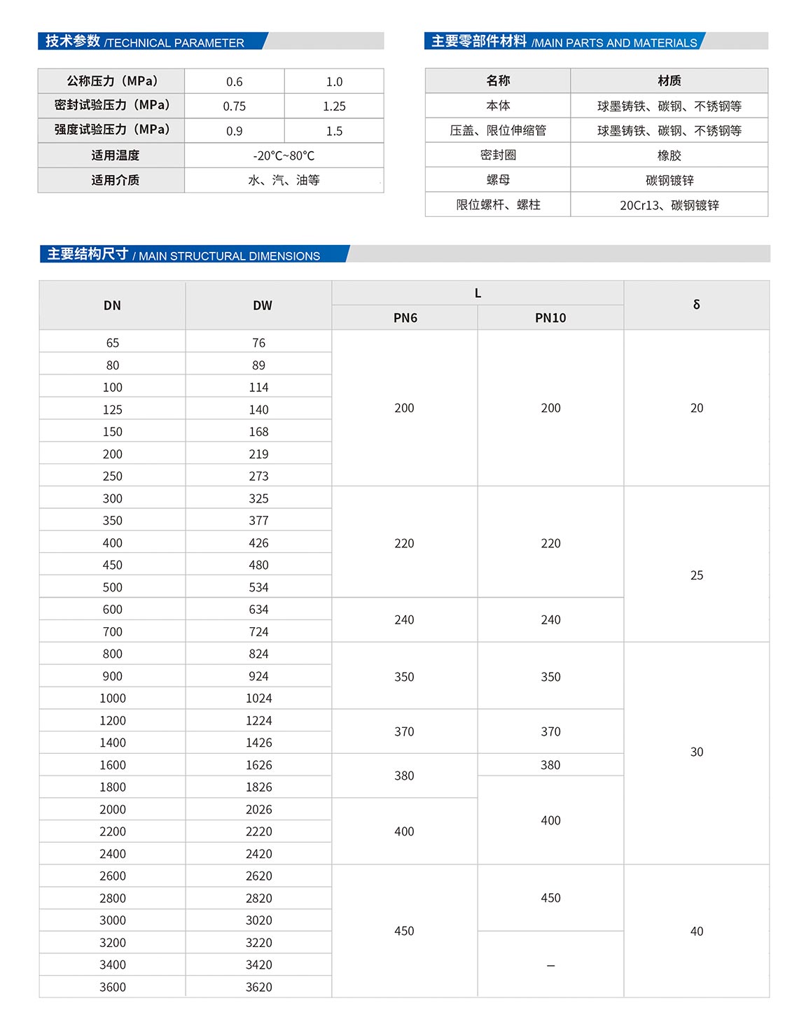 雙法蘭傳力接頭:由本體,密封圈,壓蓋,伸縮短管等主要部件組成。該產品適用于兩邊均為法蘭連接的管道中,安裝時調節產品兩端的法蘭的安裝長度,對角均勻擰緊壓蓋螺栓,使其成為一個整體,并有一定的調節量,方便安裝維修時,根據現場尺寸進行調整。在工作時可以反軸向推力傳遞至整個管道。雙法蘭傳力接頭是由法蘭松套伸縮接頭和短管法蘭,傳力螺桿等構件組成,能降低被連接件的壓力推力(盲板力)和補償管路安裝誤差。雙法蘭傳力接主要用于泵、閥門等附件的松套連接。