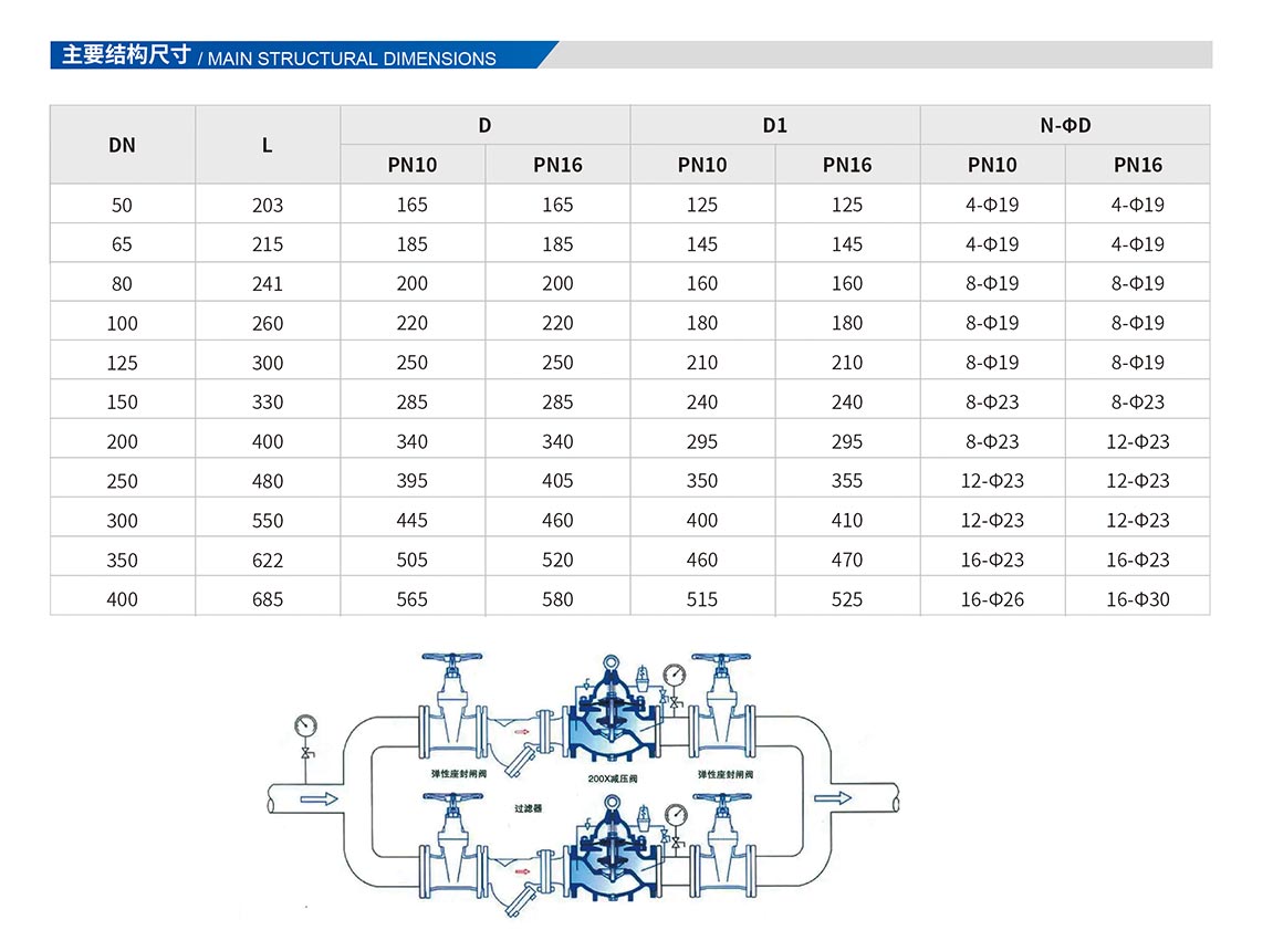 產品概述:主要控制主閥的固定出口壓力,主閥出口壓力不因進口壓力變化而改變,亦不因主閥出口流量的變化而改變其出口壓力。適用于工業給水、消防供水及生活用水管網系統。